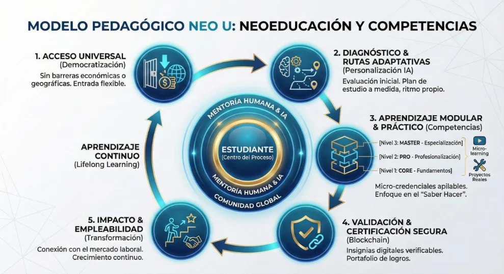 La Neoeducación es la evolución del aprendizaje humano hacia un modelo líquido, hiperaccesible y centrado en resultados. La educación tradicional estática y excluyente es cosa del pasado, la Neoeducación utiliza la tecnología para democratizar el conocimiento de alta calidad, transformando la educación profesional en una experiencia viva que se adapta al ritmo del estudiante y a las necesidades urgentes del mercado laboral.